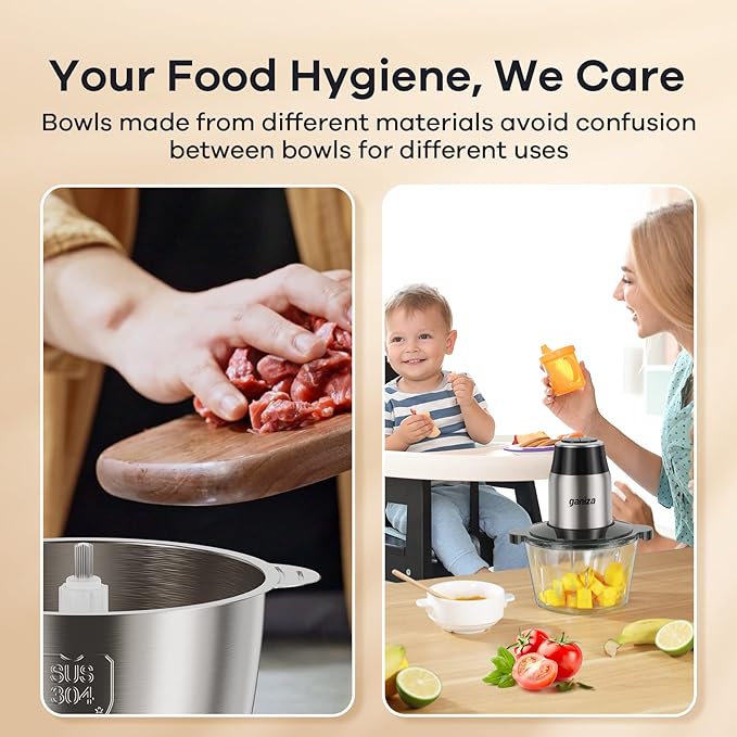 - 【Unlock Versatility with Two Bowls】Your food hygiene, we care. The Mixing Bowls are made from different materials (glass and sus 304 stainless steel) to avoid confusion between bowls for different uses, meat chopper and vegetable chopper, food processor.