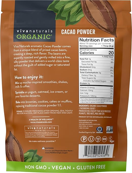 - QUALITY YOU CAN TRUST – Forget fillers and additives. Viva Naturals cacao powder is USDA-certified organic, Non-GMO Project Verified, and contains just one ingredient: organic dark cacao powder ground from the cacao beans of the Theobroma cacao tree.